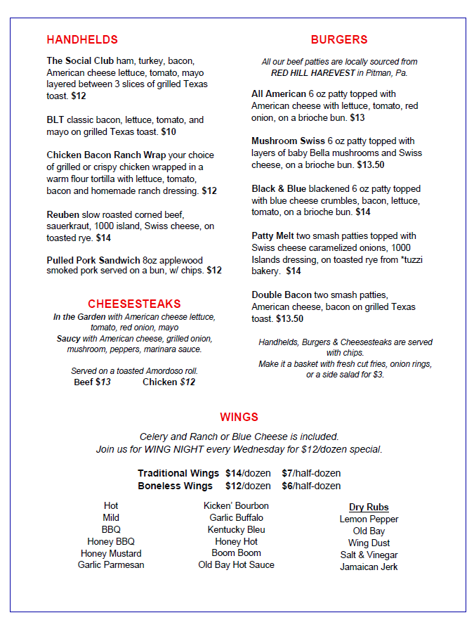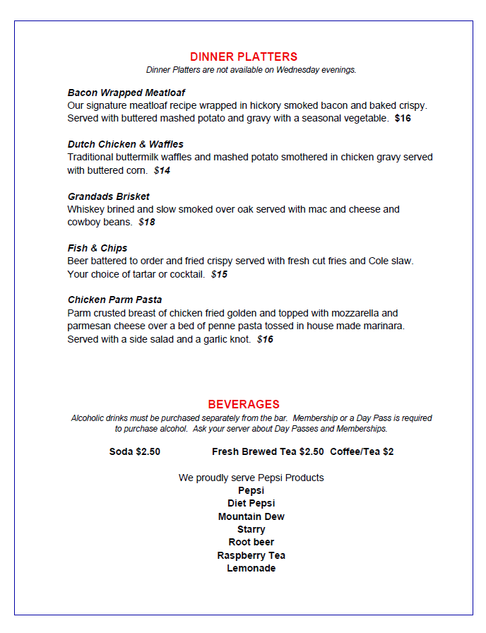 Please note, pricing is subject to change. Please refer to menus at the Club.